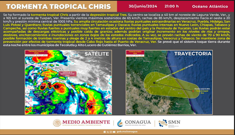 Según el aviso 364 de las 18:00 horas emitido este domingo, por la el Servicio Meteorológico Nacional y la Comisión Nacional del Agua, la Depresión Tropical Tres que se ha convertido en Tormenta Tropical Chris, se encuentra en camino, dentro de las aguas del Golfo de México y de acuerdo al pronóstico, entre la noche del domingo 30 de junio y el lunes 1 de julio tocará tierra.