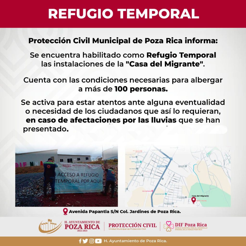 La casa del migrante será el espacio donde se atenderá a quienes quieran resguardarse, misma que se encuentra en la Avenida Papantla s/n de la colonia Jardines de Poza Rica, luego de la determinación de emitir la alerta amarilla para este municipio. (30/junio/2024)