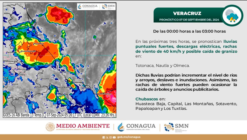 Mantente informado en las páginas www.gob.mx/conagua y https://smn.conagua.gob.mx, en las cuentas de X @conagua_mx y @conagua_clima, y de Facebook www.facebook.com/conaguamx, así como en la aplicación para dispositivos móviles ConaguaClima, donde se puede consultar el pronóstico por municipio. (06/septiembre/2024)