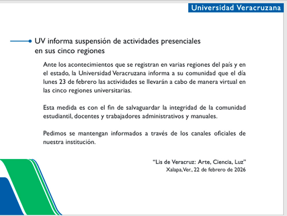 “Ante los acontecimientos que se registran en varias regiones del país y en el estado, la Universidad Veracruzana informa a su comunidad que el día lunes 23 de febrero las actividades se llevarán a cabo de manera virtual en las cinco regiones universitarias.